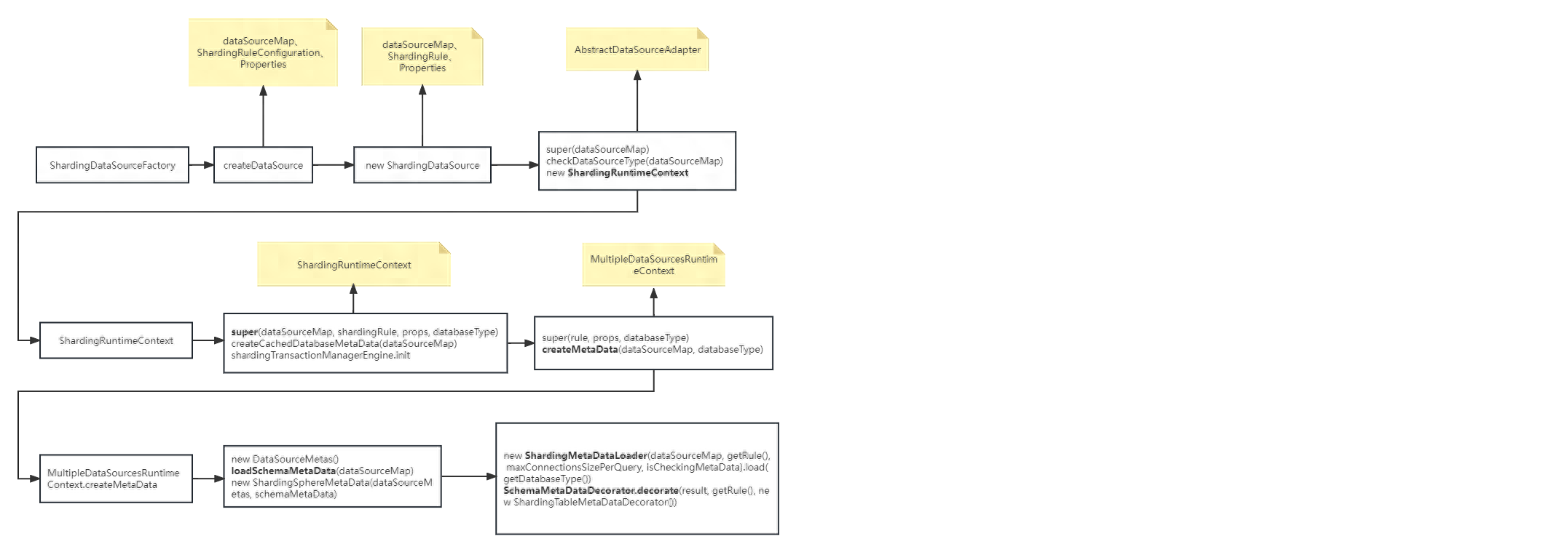 复制@Configuration @ComponentScan("org.apache.shardingsphere.spring.boot.converter") @EnableConfigurationProperties({ SpringBootShardingRuleConfigurationProperties.class, SpringBootMasterSlaveRuleConfigurationProperties.class, SpringBootEncryptRuleConfigurationProperties.class, SpringBootPropertiesConfigurationProperties.class, SpringBootShadowRuleConfigurationProperties.class}) @ConditionalOnProperty(prefix = "spring.shardingsphere", name = "enabled", havingValue = "true", matchIfMissing = true) @AutoConfigureBefore(DataSourceAutoConfiguration.class) @RequiredArgsConstructor // 实现EnvironmentAware接口(spring的扩展点),会在初始化该类时调用setEnvironment方法 public class SpringBootConfiguration implements EnvironmentAware { private final SpringBootShardingRuleConfigurationProperties shardingRule; private final SpringBootMasterSlaveRuleConfigurationProperties masterSlaveRule; private final SpringBootEncryptRuleConfigurationProperties encryptRule; private final SpringBootShadowRuleConfigurationProperties shadowRule; private final SpringBootPropertiesConfigurationProperties props; private final Map<String, DataSource> dataSourceMap = new LinkedHashMap<>(); private final String jndiName = "jndi-name"; // 项目中未采用读写分离【单库分表】,亿华云满足该条件,下面看下shardingDataSource是如何创建的 @Bean @Conditional(ShardingRuleCondition.class) public DataSource shardingDataSource() throws SQLException { return ShardingDataSourceFactory.createDataSource(dataSourceMap, new ShardingRuleConfigurationYamlSwapper().swap(shardingRule), props.getProps()); } @Bean @Conditional(MasterSlaveRuleCondition.class) public DataSource masterSlaveDataSource() throws SQLException { return MasterSlaveDataSourceFactory.createDataSource(dataSourceMap, new MasterSlaveRuleConfigurationYamlSwapper().swap(masterSlaveRule), props.getProps()); } @Bean @Conditional(EncryptRuleCondition.class) public DataSource encryptDataSource() throws SQLException { return EncryptDataSourceFactory.createDataSource(dataSourceMap.values().iterator().next(), new EncryptRuleConfigurationYamlSwapper().swap(encryptRule), props.getProps()); } @Bean @Conditional(ShadowRuleCondition.class) public DataSource shadowDataSource() throws SQLException { return ShadowDataSourceFactory.createDataSource(dataSourceMap, new ShadowRuleConfigurationYamlSwapper().swap(shadowRule), props.getProps()); } @Bean public ShardingTransactionTypeScanner shardingTransactionTypeScanner() { return new ShardingTransactionTypeScanner(); } @Override public final void setEnvironment(final Environment environment) { String prefix = "spring.shardingsphere.datasource."; for (String each : getDataSourceNames(environment, prefix)) { try { dataSourceMap.put(each, getDataSource(environment, prefix, each)); } catch (final ReflectiveOperationException ex) { throw new ShardingSphereException("Cant find datasource type!", ex); } catch (final NamingException namingEx) { throw new ShardingSphereException("Cant find JNDI datasource!", namingEx); } } } private List<String> getDataSourceNames(final Environment environment, final String prefix) { StandardEnvironment standardEnv = (StandardEnvironment) environment; standardEnv.setIgnoreUnresolvableNestedPlaceholders(true); return null == standardEnv.getProperty(prefix + "name") ? new InlineExpressionParser(standardEnv.getProperty(prefix + "names")).splitAndEvaluate() : Collections.singletonList(standardEnv.getProperty(prefix + "name")); } @SuppressWarnings("unchecked") private DataSource getDataSource(final Environment environment, final String prefix, final String dataSourceName) throws ReflectiveOperationException, NamingException { Map<String, Object> dataSourceProps = PropertyUtil.handle(environment, prefix + dataSourceName.trim(), Map.class); Preconditions.checkState(!dataSourceProps.isEmpty(), "Wrong datasource properties!"); if (dataSourceProps.containsKey(jndiName)) { return getJndiDataSource(dataSourceProps.get(jndiName).toString()); } DataSource result = DataSourceUtil.getDataSource(dataSourceProps.get("type").toString(), dataSourceProps); DataSourcePropertiesSetterHolder.getDataSourcePropertiesSetterByType(dataSourceProps.get("type").toString()).ifPresent( dataSourcePropertiesSetter -> dataSourcePropertiesSetter.propertiesSet(environment, prefix, dataSourceName, result)); return result; } private DataSource getJndiDataSource(final String jndiName) throws NamingException { JndiObjectFactoryBean bean = new JndiObjectFactoryBean(); bean.setResourceRef(true); bean.setJndiName(jndiName); bean.setProxyInterface(DataSource.class); bean.afterPropertiesSet(); return (DataSource) bean.getObject(); } }1.2.3.4.5.6.7.8.9.10.11.12.13.14.15.16.17.18.19.20.21.22.23.24.25.26.27.28.29.30.31.32.33.34.35.36.37.38.39.40.41.42.43.44.45.46.47.48.49.50.51.52.53.54.55.56.57.58.59.60.61.62.63.64.65.66.67.68.69.70.71.72.73.74.75.76.77.78.79.80.81.82.83.84.85.86.87.88.89.90.91.92.93.94.95.96.97.98.99. ShardingDataSourceFactory#createDataSource 复制public ShardingDataSource(final Map<String, DataSource> dataSourceMap, final ShardingRule shardingRule, final Properties props) throws SQLException { super(dataSourceMap); checkDataSourceType(dataSourceMap); runtimeContext = new ShardingRuntimeContext(dataSourceMap, shardingRule, props, getDatabaseType()); }1.2.3.4.5.6.7. ShardingRuntimeContext(shardingsphere上下文-类比于spring中的applicationContext) 复制public ShardingRuntimeContext(final Map<String, DataSource> dataSourceMap, final ShardingRule shardingRule, final Properties props, final DatabaseType databaseType) throws SQLException { super(dataSourceMap, shardingRule, props, databaseType); cachedDatabaseMetaData = createCachedDatabaseMetaData(dataSourceMap); shardingTransactionManagerEngine = new ShardingTransactionManagerEngine(); shardingTransactionManagerEngine.init(databaseType, dataSourceMap); } // 调用父类方法加载元数据 protected MultipleDataSourcesRuntimeContext(final Map<String, Da