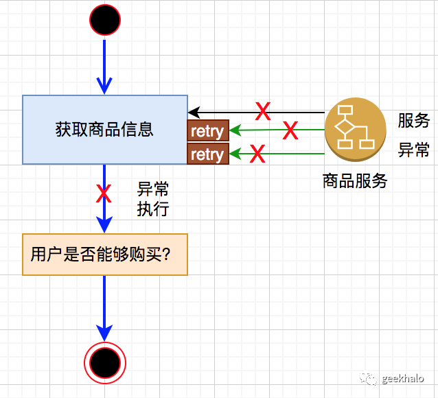 在获取商品失败后,系统自动触发 Retry 机制;由于是商品服务本身出了问题,第二次请求仍旧失败;服务又触发了第三次请求,仍未获取结果;达到最大重试次数,仍旧无法获取商品,只能通过异常中断用户请求;通过 Retry 机制未能将流程从异常中恢复过来,反而给下游的 商品服务 造成了巨大伤害。