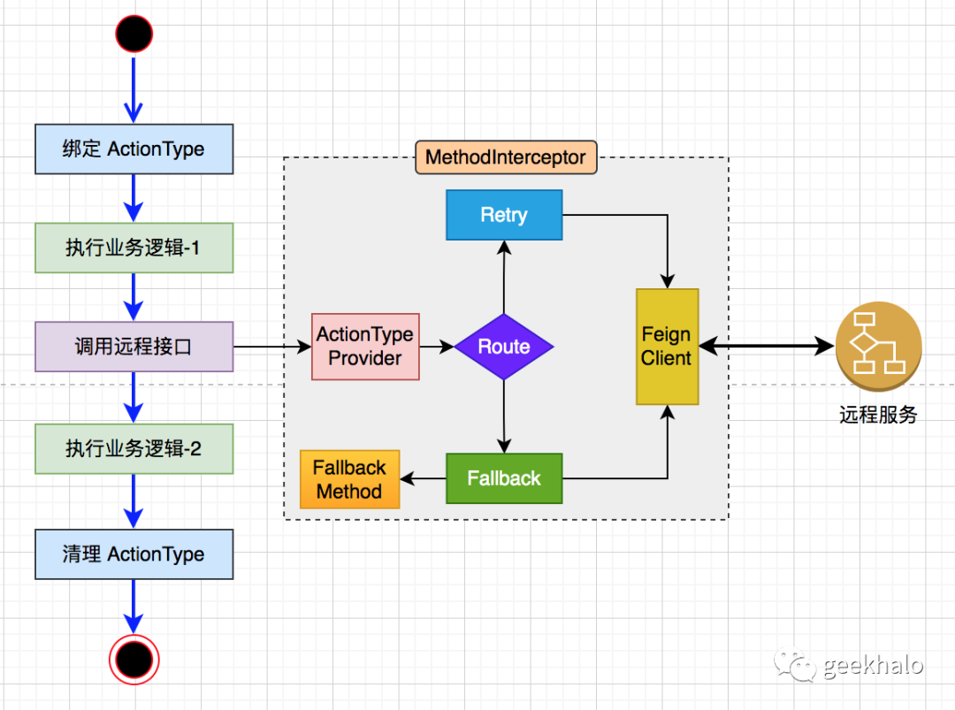 读取配置信息,将请求类型(ActionType)绑定到线程上下文;然后执行正常业务逻辑当调用 @SmartFault 注解的方法时,会被 SmartFaultMethodInterceptor 拦截器拦截拦截器通过 ActionTypeProvider 获取当前的 ActionType;