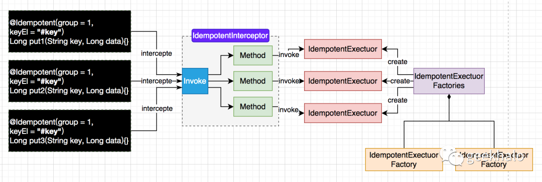 IdempotentInterceptor 会对 @Idempotent 注解标记的方法进行拦截;当方法第一次被调用时,会读取 @Idempotent 注解上的配置信息,使用 IdempotentExecutorFactoris 为每个方法创建一个 IdempotentExecutor 实例;在方法调用时,将请求直接路由到 IdempotentExecutor 实例,由 IdempotentExecutor 完成核心流程;其中,IdempotentExecutorFactories 拥有多个 IdempotentExecutorFactory 实例,并根据 @Idempotent 上配置的 executorFactory 属性使用对应的实例完成创建工作;从设计上看,系统中可以同时配置多个 IdempotentExecutorFactory,然后根据不同的业务场景设置不同的 executorFactory。