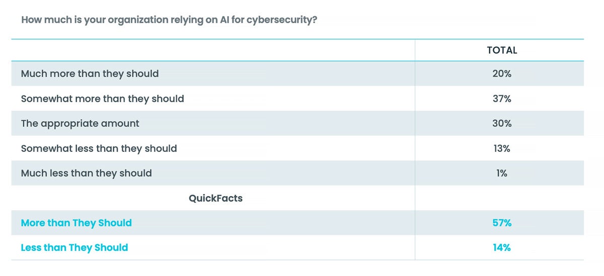 以下看看受访者如何看待他们的组织在网络安全计划中对人工智能的依赖。
