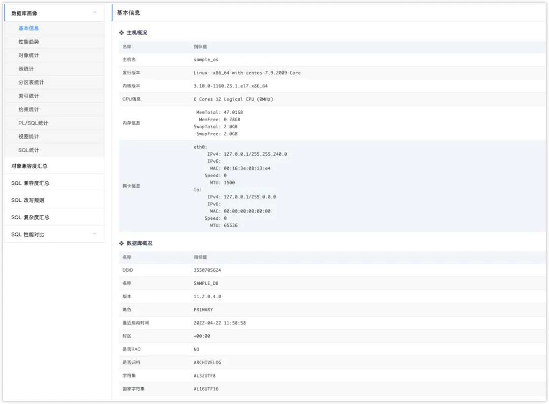 这里我们重点看看其输出报告,报告采用网页或EXCEL文件的格式,内部包含了丰富的信息。下面逐一说明下:❖数据库画像这部分通过扫描源库,收集到源数据库基本信息、性能、对象、SQL等各类信息。在基本信息部分,又包括有主机资源层面信息(CPU、MEM、NET)、数据库信息(版本、角色、架构、归档状态、字符集)。