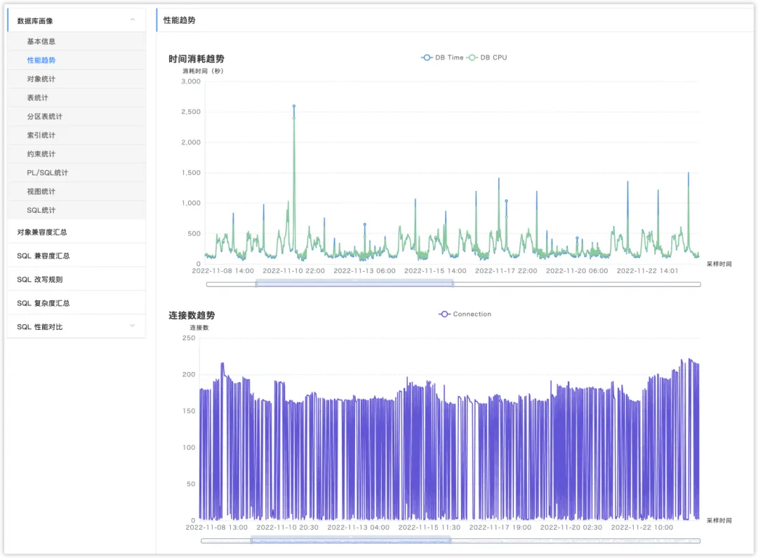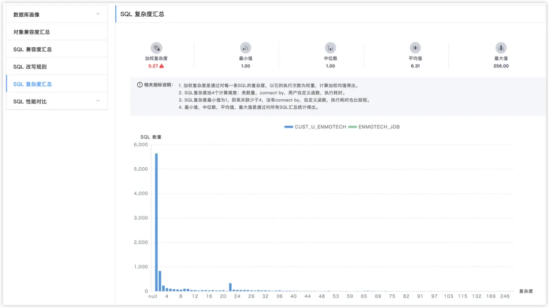 这部分则是通过复杂度评估标准,判断出复杂 SQL 的分布情况。这些复杂的 SQL 也是在迁移过后需要重点关注性能问题,这样可以有效避免性能问题可能导致的业务故障。目前复杂度的评判标准包括有表关联的数量、Connect By语法使用、自定义函数数量、函数执行耗时。针对每条SQL的复杂度都会按照上述标准进行汇总评估,给出SQL复杂度。