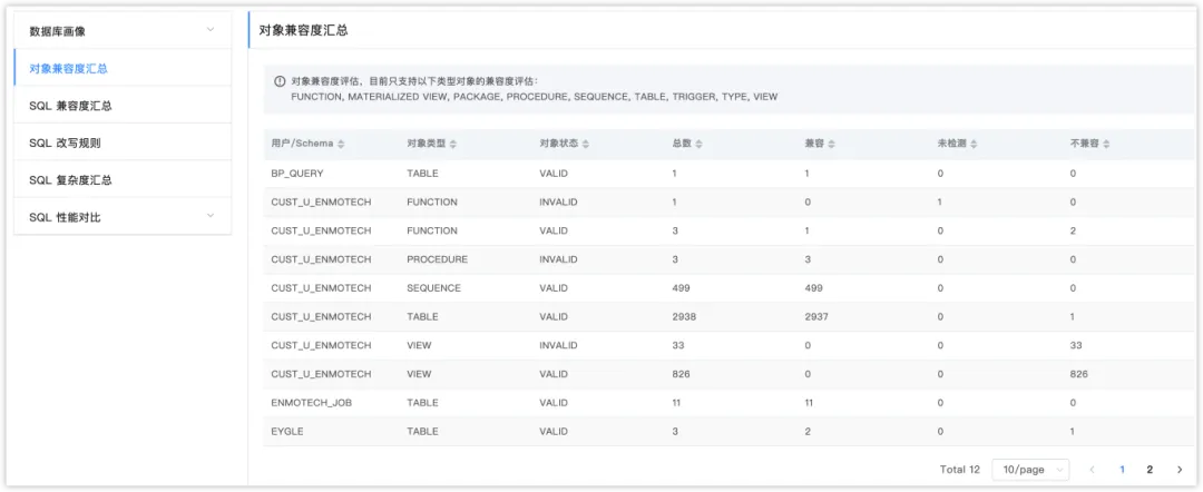 这部分通过对比源库与目标库的兼容能力,分析出对象层面的兼容情况,并分类展示。在展示中按照用户名、对象类型、状态进行汇总,展示相关分类的对象总数以及兼容情况。针对不兼容的对象,就需要考虑在真正迁移中进行修改。