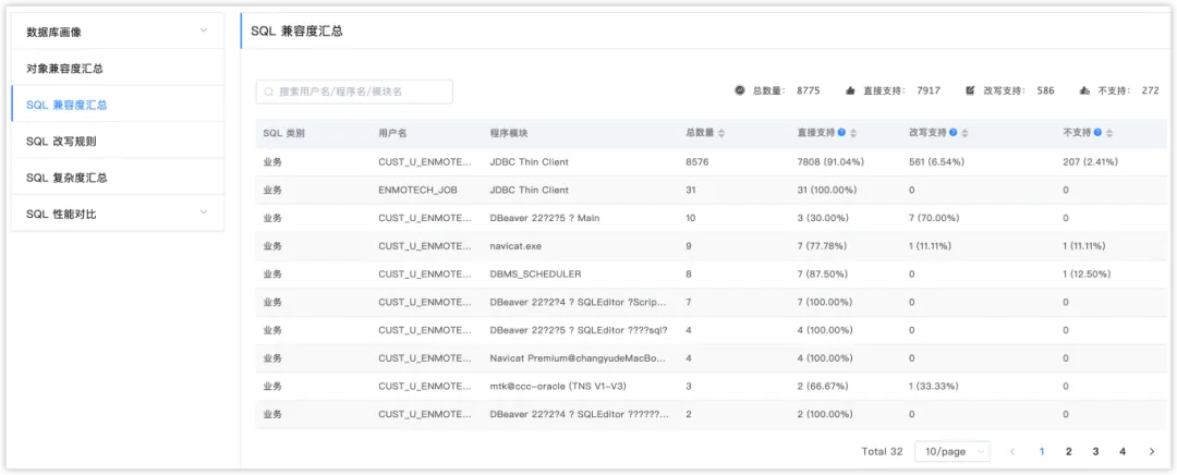 这部分通过对比源库与目标库的SQL兼容情况,评估给出SQL兼容(直接兼容、改写兼容)及不兼容的情况。展示中按照用户名、程序名、模块名汇总,展示系统中采集到的所有 SQL,以及这些 SQL 在目标库支持情况。这些信息对于后续评估改造的工作量评估,有非常直观的指导意义。企商汇