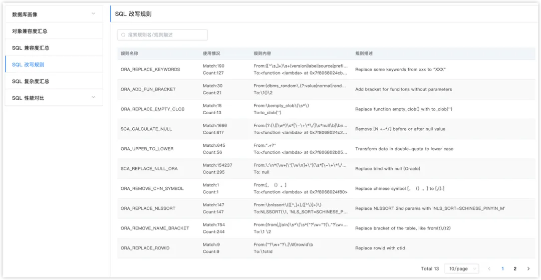 这部分内容根据扫描后的结果,结合系统内置的改写规则,给出该条规则的触发情况,包括该规则在 SQL 中的命中数量及为规则匹配的 SQL 数量。