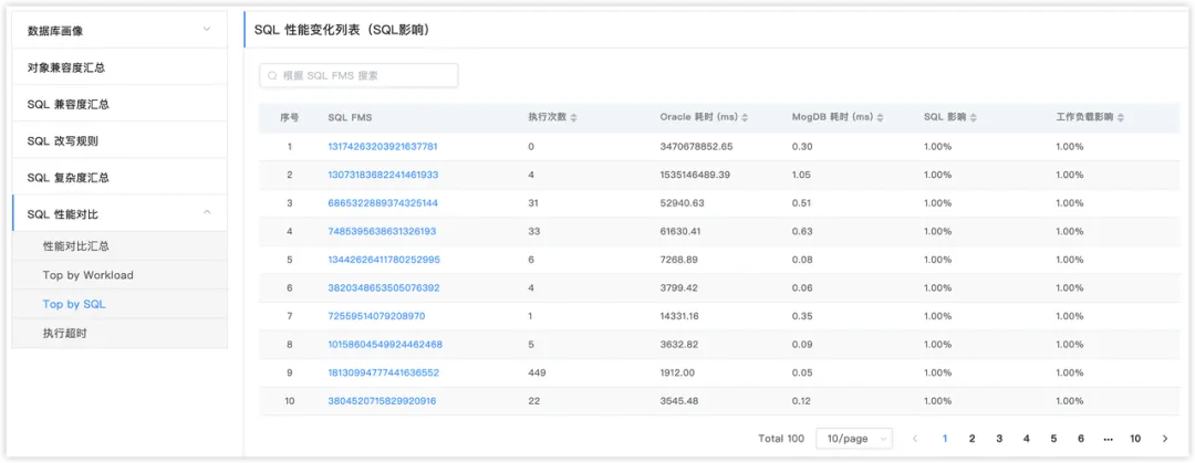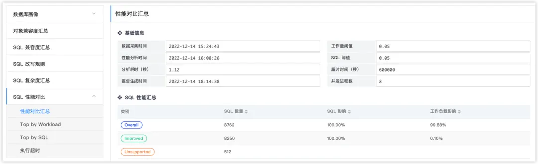 这部分是在结构、数据迁移完毕后,真实执行SQL,采集源端和目标端的执行性能进行比较。按照执行性能的总体情况及分列情况的展示。其中总体部分,可以简单评估下迁移完成后在目标库的整体运行状态,包括性能有提升的SQL比例、性能下降的SQL比例、不支持的SQL比例等。