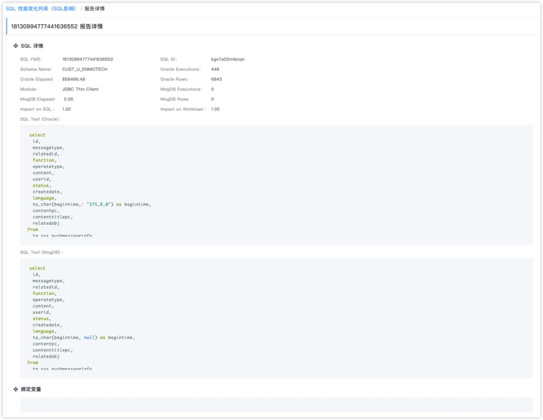 此外针对每条SQL可以详细展开,包括SQL文本、绑定变量、执行计划、执行详情、关联对象、统计信息等。