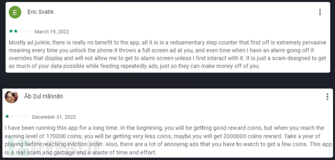 Google Play 上的一些用户留下评论称“Lucky Step - Waling Tracker”充当广告软件,在屏幕解锁时加载全屏广告,甚至覆盖活动窗口。