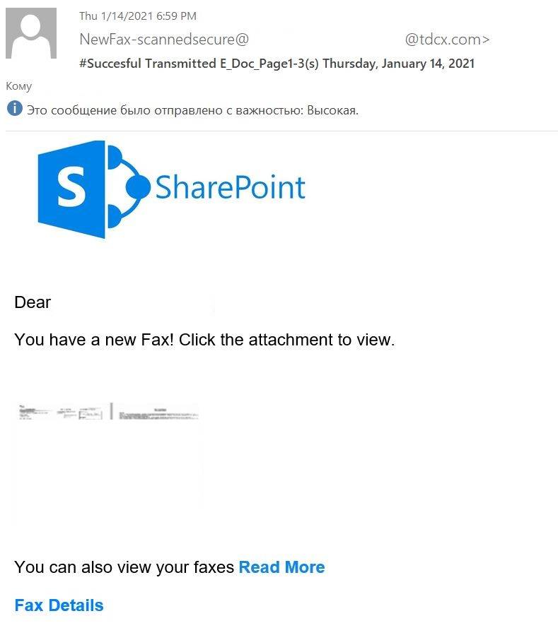 网络钓鱼电子邮件示例,要求员工按照链接阅读传真留言