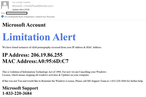 让我们研究一下这种攻击的潜在场景,公司员工收到来自假冒大型服务提供商(例如Microsoft)发来的电子邮件,该电子邮件被专门设置为正式邮件。该消息包含要求受害者快速做出决定的信息。攻击者还可能试图恐吓接收者。下面的示例说明从受害人的计算机访问了儿童色情内容。为了解决此问题,攻击者要求员工以特定号码联系技术支持。如果受害者实际拨打了特定的电话号码,那么攻击者可能会冒充Microsoft技术支持人员,并欺骗受害者以泄漏其用户名和密码,以访问公司的内部系统。
