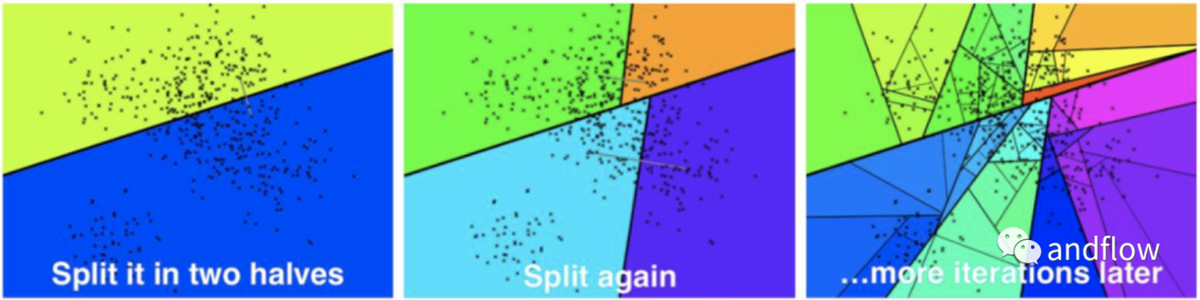 ANNOY的核心是一种基于随机投影和树的算法。它由Erik Bernhardsson于2015年在Spotify工作时开发。ANNOY设计目标是实现在100到1000个密集维度的数据集中进行搜索。为了计算最近的邻居,它将点集分成两半,并递归地进行,直到每个集合都有k个项目。通常k应该在100左右(见下图)。