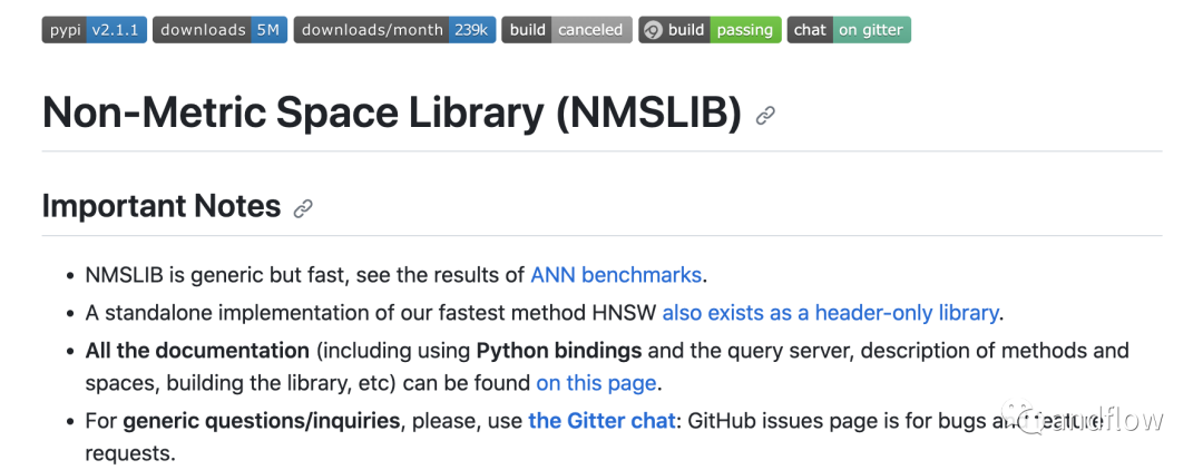 Nmslib (Non-Metric Space Library)是一个于非度量空间的开源向量数据库。是一个高效的跨平台相似性搜索库,也是一个评估相似性搜索方法的工具包,并且它的核心库没有任何第三方依赖项。