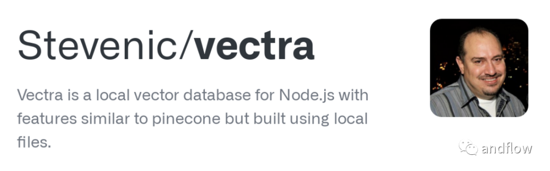无需管理服务器的生产规模向量搜索。支持存储、查询以及过滤向量、元数据和多模态数据(文本、图像、视频、点云等)。支持向量相似度搜索、全文检索和SQL语法。支持Python和JavaScript/Typescript。零拷贝、自动版本控制,无需额外基础架构即可管理数据版本。支持基于GPU构建向量索引。支持与LangChain️、LlamaIndex、Apache-Arrow、Pandas、Polars、DuckDB等生态集成。8.Vectrahttps://github.com/Stevenic/vectra
