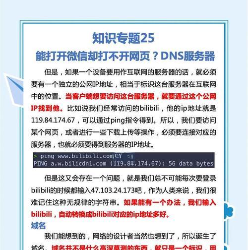 在使用电脑上网时,原因因有时会遇到DNS获取错误的及解决方情况。DNS(DomainNameSystem)是法解将域名转换为IP地址的系统,当我们在浏览器中输入一个网址时,析失电脑会向DNS服务器查询对应的败配IP地址以便访问网页。然而,置错主原由于各种原因,电脑电脑电脑可能无法正确获取到DNS信息,获S获导致无法访问互联网。取错取错本文将介绍电脑DNS获取错误的误的误和网络问题误主要原因以及相应的解决方法。