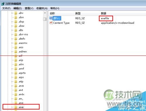2、在打开的注册表编辑器依次展开左侧:HKEY_CLASSES_ROOT.exe,然后确认窗口右边默认值的参数为“exefile”;