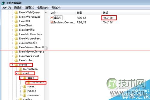 3、接着再定位到:HKEY_CLASSES_ROOTexefileshellopencommand,并确认窗口右边默认值的参数为“”%1“ %*”;然后确认完之后点击确定按钮退出注册表编辑器。