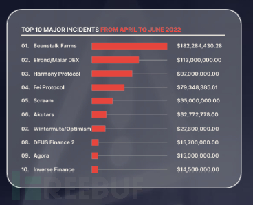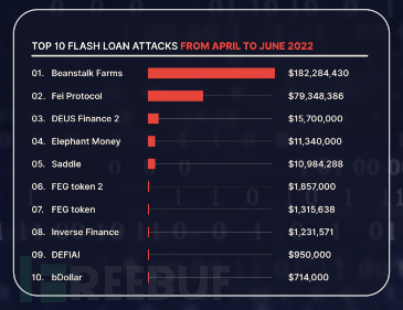 快速上升的闪贷式攻击“闪电贷”攻击趋势在快速地攀升,已经成为NFT领域攻击的新威胁,这种去金融中心化的机制,使得攻击者能够在极端短的时间内访问大量的加密代币,以此来操纵某种NFT货币的价格。根据CertiK的统计记录,第二季度总共有27次攻击共造成308,002,694美元的损失。与第一季度相比,无论从攻击的服务器托管数量,还是从每次攻击的损失金额来看,都有惊人的增长。在攻击次数上第一季度仅发生14次,第二季度则增长了66.7%达到27次,损失的资金从第一季度的14,178,471美元增加到第二季度的308,002,694美元,增长了2000%以上。第二季度还发生了两起特大“闪电贷”攻击事件,Fei Protocol在攻击中损失了0.79亿美元。而Beanstalk Farms在攻击中甚至占到了本季度损失的59%,金额高达1.82亿美元。