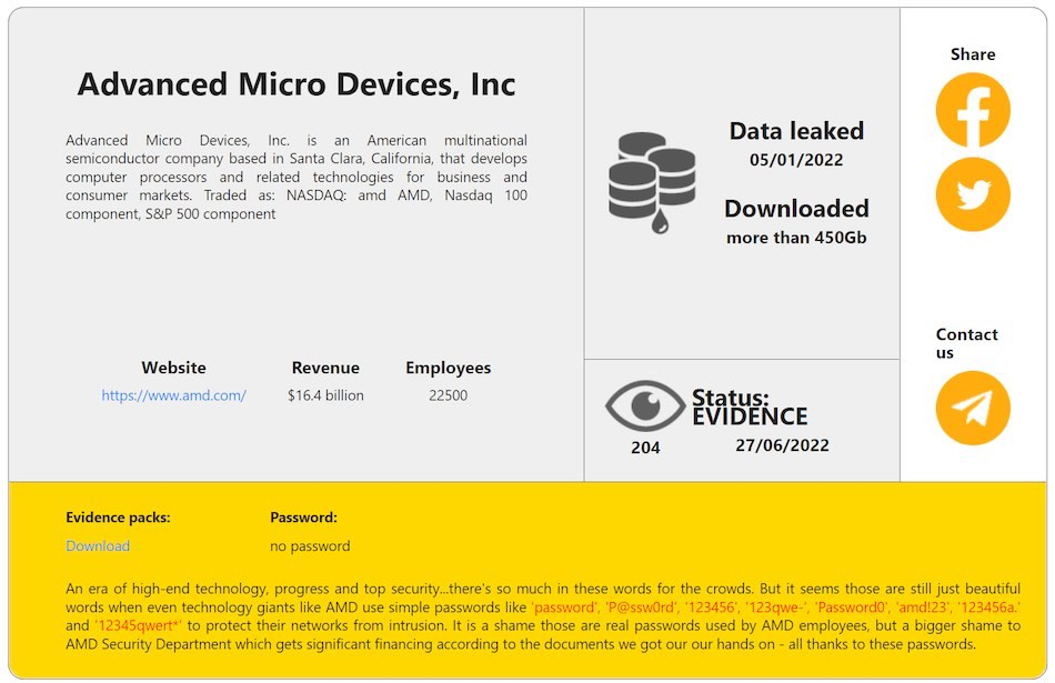 一直到6月28日,AMD发表声明称,公司已经知道有不法分子声称拥有来自AMD的被盗数据,公司目前正在针对此情况展开调查。