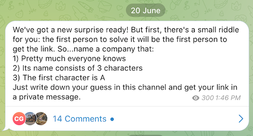 为了让整个过程显得更“有趣”一点。6月20日,该组织在Telegram宣布入侵了一家大型公司,还用比赛的形式出了一个谜语,看看是否有人能猜对: