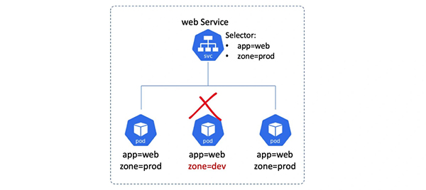 Service 对象有一个 Label Selector 字段,这个字段是一个标签列表,符合列表条件的 Pod 就会被服务纳入到服务的负载均衡范围之中。参见下图: