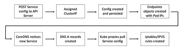 向 API Server 用 POST 方式提交一个新的 Service 定义; 这个请求需要经过认证、鉴权以及其它的准入策略检查过程之后才会放行; Service 得到一个 ClusterIP(虚拟 IP 地址),并保存到集群数据仓库; 在集群范围内传播 Service 配置; 集群 DNS 服务得知该 Service 的创建,据此创建必要的 DNS A 记录。上面过程中,第 5 个步骤是关键环节。集群 DNS 使用的是 CoreDNS,以 Kubernetes 原生应用的形式运行。