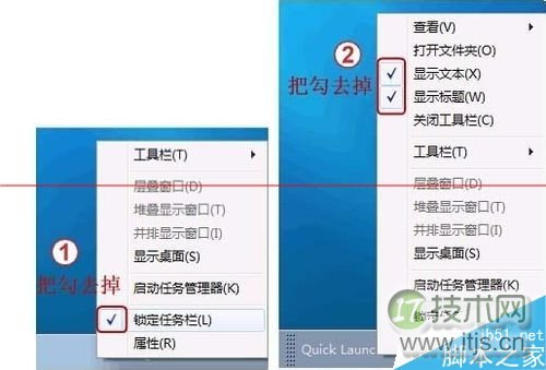 4、解锁后,右键点击Quick Launch 工具栏,将“显示标题”和“显示文本”的勾都给取消了;