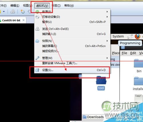 1、退出linux系统,找到虚拟机的菜单栏,里面有一个虚拟机——设置选项。