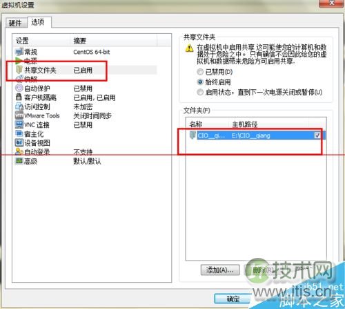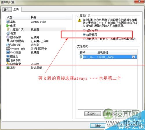 4、首先将共享文件夹设置为始终启用,这样在下次使用的时候就会自动的开启了。