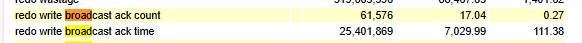 除此之外,在分析Log File sync问题的时候,还需要关注redo write broadcast ack count/redo write broadcast ack time这组指标。它们的值和RAC环境中Log File sync等待延时是密切相关的。